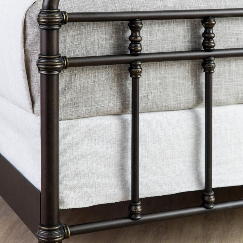 The Merrick Iron Bed by Wesley Allen brings romantic charm and handcrafted detail to your bedroom with its graceful curves, decorative castings, and vintage-inspired spindle design. Its gently arched headboard and footboard frame slender iron spindles for an airy, open look, while ornate central motifs add a touch of refined artistry. Designed and crafted by skilled iron artisans, the Merrick blends elegance with heirloom-level durability for a bed that will be treasured for generations.