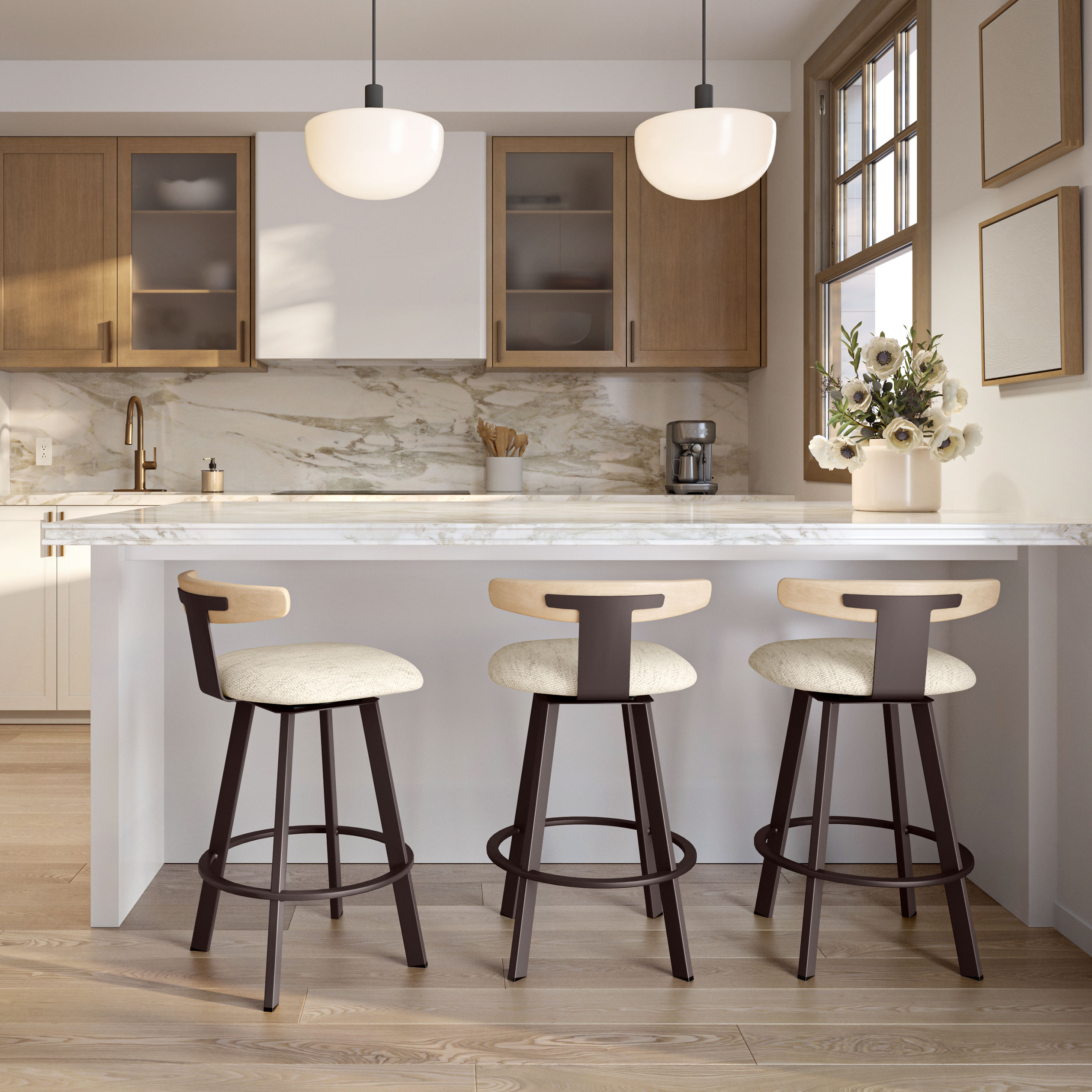 The Asher Swivel Stool draws inspiration from Scandinavian style, effortlessly complementing contemporary, modern, or coastal spaces. Its sleek metal frame pairs beautifully with a gently curved wooden backrest, providing just the right amount of support and natural elegance. The padded seat ensures lasting comfort, while the smooth 360-degree swivel allows for effortless movement. Designed with space in mind, the stool tucks neatly under the counter, keeping your kitchen or bar clutter-free.