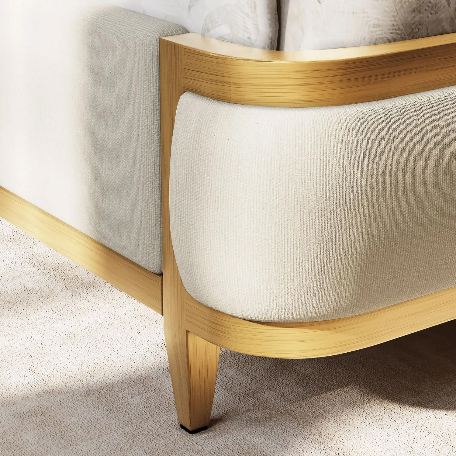 The Broadway Bed showcases a graceful balance of curves and craftsmanship. Its upholstered shelter-style headboard wraps gently around the bed, creating a feeling of comfort and sophistication, while the matching upholstered footboard and side panels provide a cohesive, finished look. Softly rounded corners enhance its luxurious feel and give the structure a warm, inviting presence.