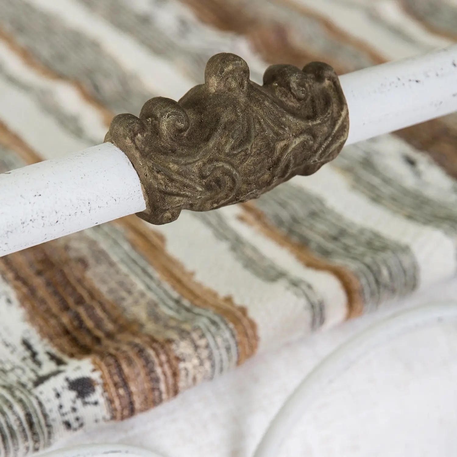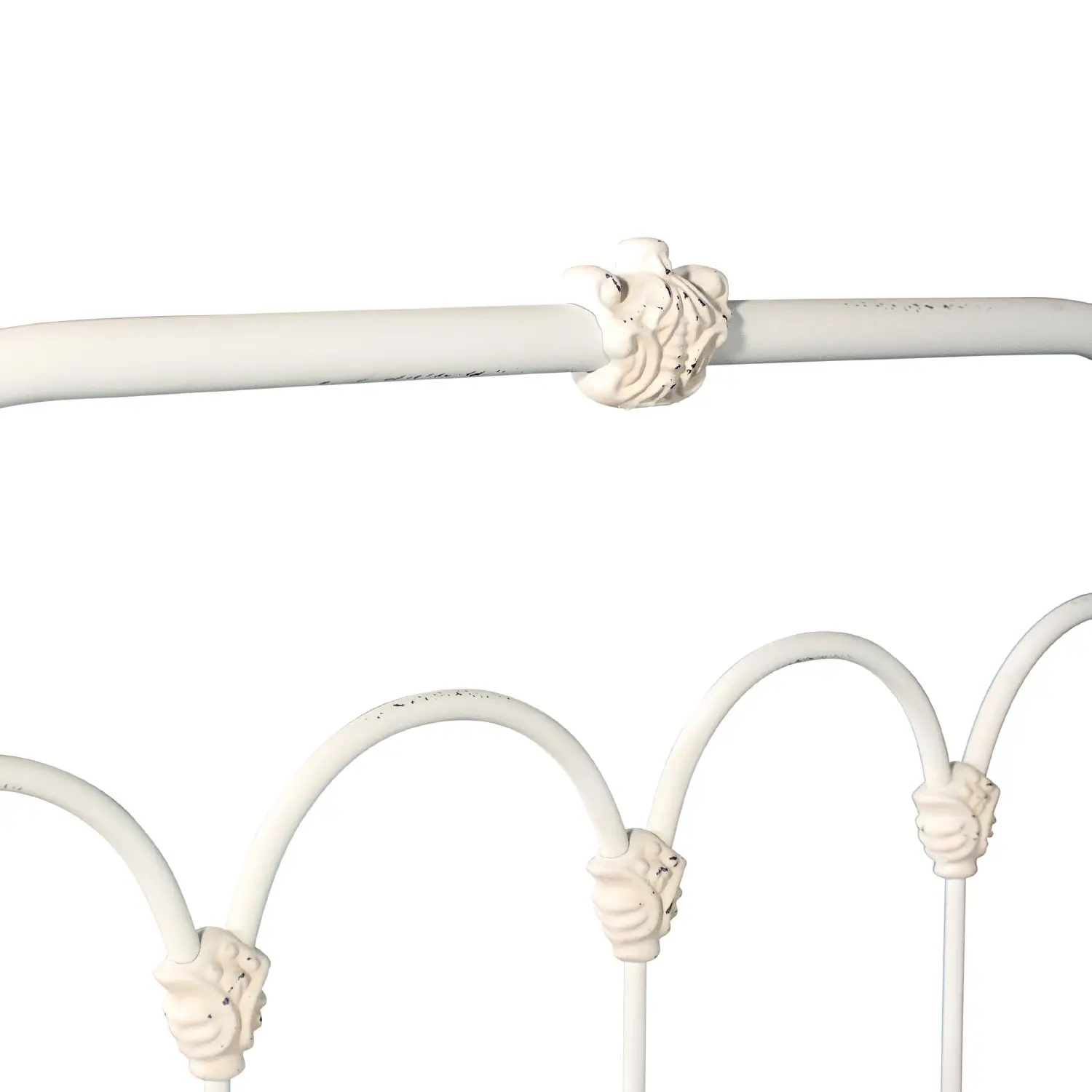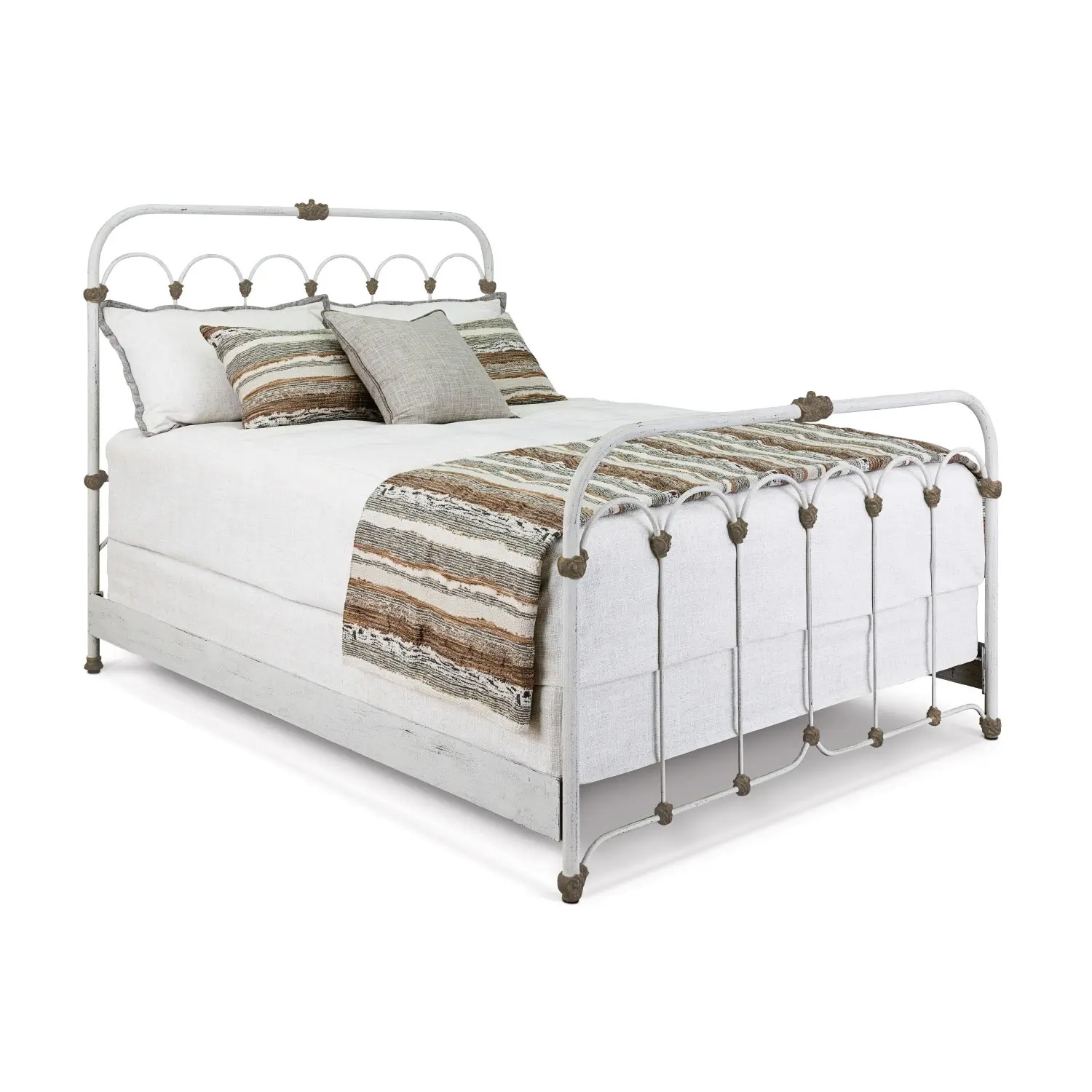 The Hillsboro Iron Bed is defined by its graceful arches and refined proportions. The matching headboard and footboard feature rounded corners framing open panels filled with elegant arch patterns resting above slender, durable spokes. Decorative hand-poured castings at each joint highlight the meticulous craftsmanship and reinforce the structure.