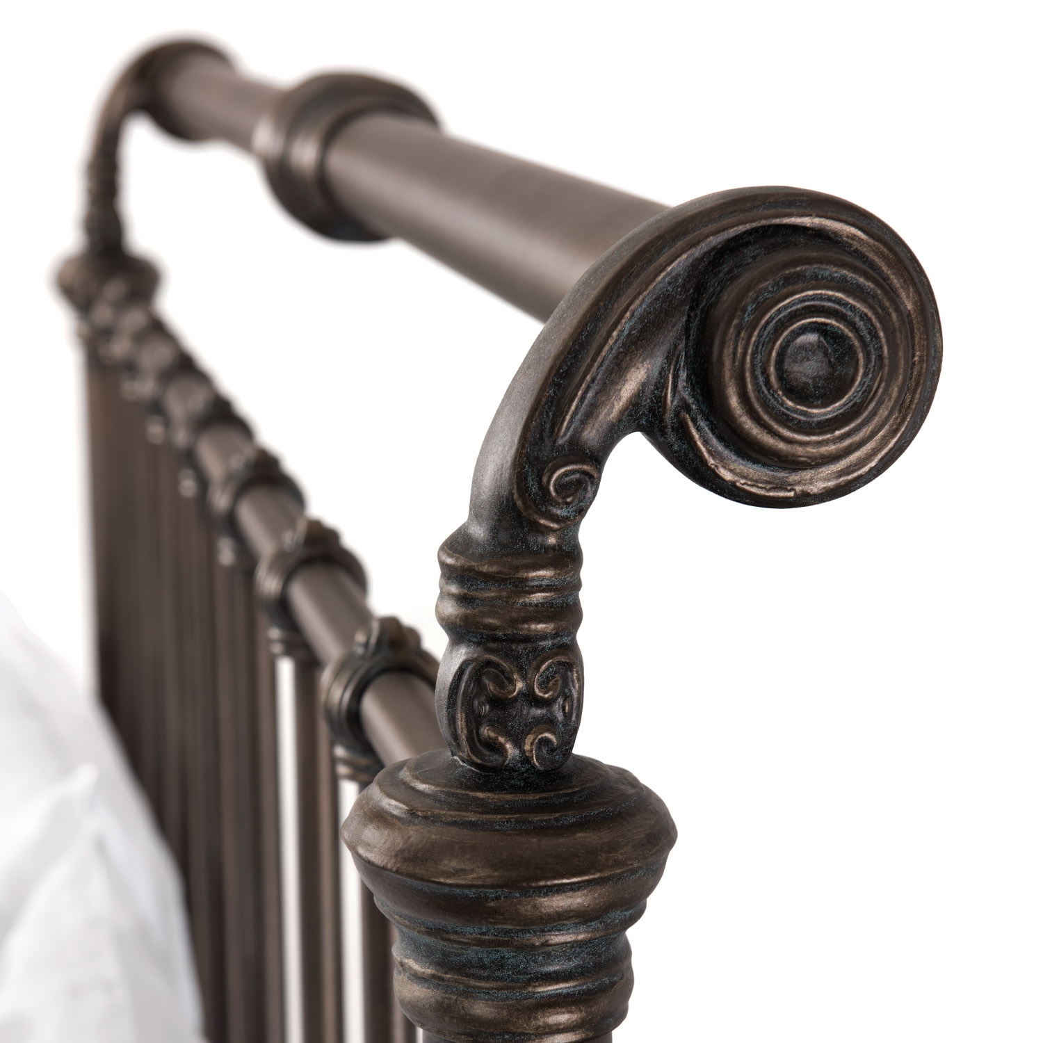 The Sheffield Headboard is the centerpiece of this design, featuring elegant upright elements crowned by a sculpted top rail with softly scrolled ends and striking central castings. Within the frame, slender yet durable vertical bars maintain an open, refined feel, while hand-poured castings reinforce both beauty and strength at every joint.