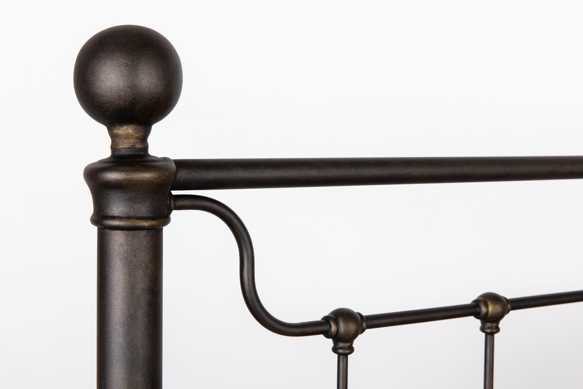 The Tucker Iron Bed softens its clean silhouette with rounded ball finials and subtle bends in the ironwork, giving the design a handcrafted, approachable feel. The open headboard and footboard allow light to pass through, enhancing the sense of space in the room while highlighting wall color, window light, and decorative bedding.