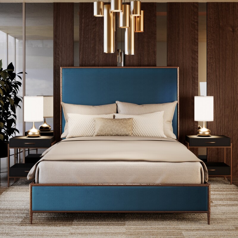 The Nile Upholstered Iron Bed by Wesley Allen offers the perfect combination of modern style and heirloom-quality construction. Handcrafted by skilled iron artisans, the Nile features a streamlined upholstered headboard paired with a sleek 3-side metal profile platform frame. Built to last for generations, this bed delivers both luxury and durability in one stunning design.